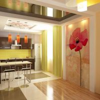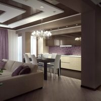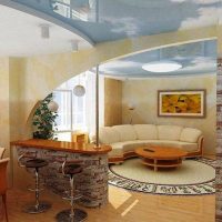 The ceiling is common for two rooms, and therefore it should be decorated in the same style. A multi-level ceiling is perfect, as it allows you to make spotlights, and also fits most styles in the interior. In order not to overload the design, it is recommended to choose a light finish for the ceiling.