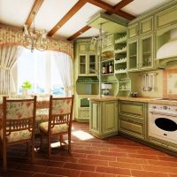 Purchase shelves the same as floor cabinets. Whiten the walls with a simple whitewash, or paint with white paint. On the perimeter of the desktop of the kitchen set, put vases with green plants. Since we have a double style - Provence, combined with the Scandinavian motif, white and green colors will be the best choice, fully characterizing these two directions. But in white, you can add a little beige, warm shade.
