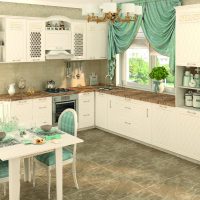 The tabletop is selected with a marble texture. Choose another dominant interior color. Since one is already there - white. It is set by the "Provence" style. The second color, for example, is green. Then the plastic cover of the desktop headset will be white-green, in marble texture. Make part of the apron of the same structure as the desktop.