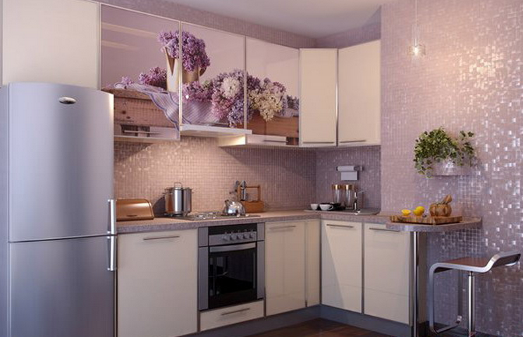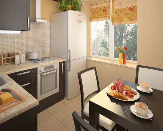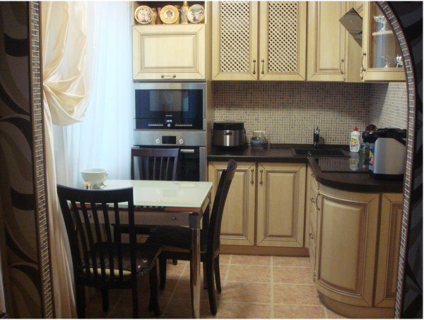 To the kitchen 5 square meters. to fit both the working and dining areas, there is no other way out than to plan the arrangement of furniture in an L-shaped or linear manner.