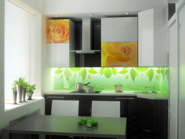 Even in such a small kitchen you can show imagination and create an interior in almost any style. Perhaps only Rococo and Baroque will not be feasible, because they are based on a combination of massive pieces of furniture and bright, saturated colors (burgundy, gold). All other stylistic directions are quite appropriate.