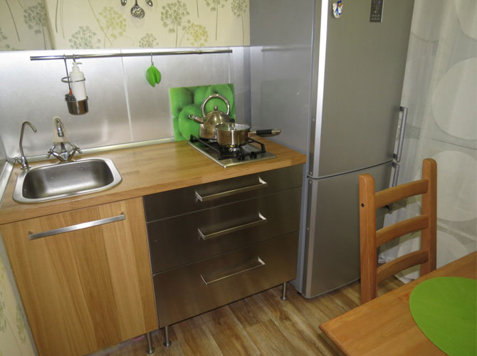 Often the tiny Khrushchev kitchens are cluttered with furniture and household appliances so much that there is only a slight free space in the very center of the room. Such clutter can be easily avoided if you take into account several simple rules when designing a kitchen: