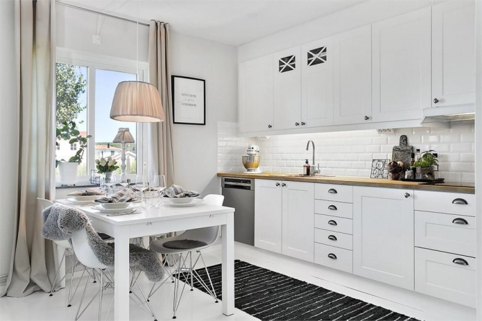 In such an interior, flowers in white pots placed on a windowsill will become excellent decorative elements.You can enhance the spring-summer theme by installing a kitchen apron with delicate floral patterns or a bright print.