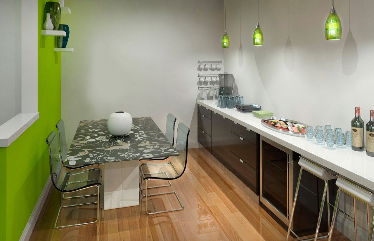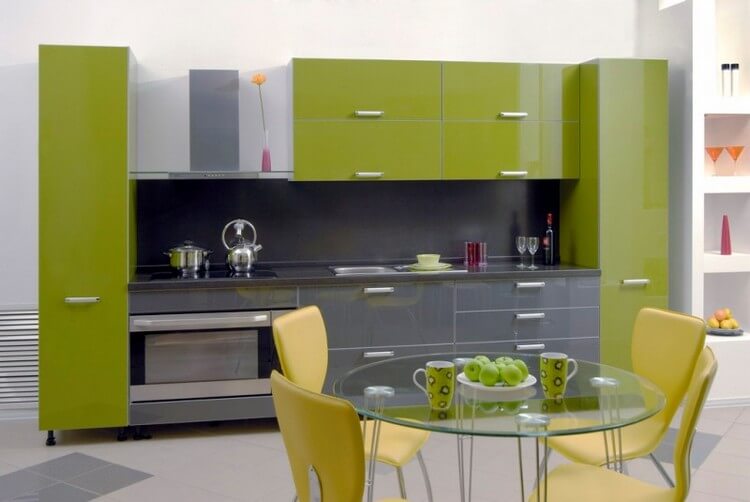Any shades of green act on the human psyche soothingly and relaxingly. The combination of gray and green is actively used in the popular eco style. Also, any imitations of wood and other natural materials will look good here. As green accents, you can use quite large objects: countertops, chairs, parts of facades and apron tiles.