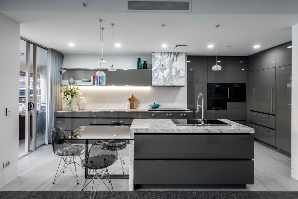 The gray kitchen in the interior is a very multifaceted concept. It does not set any limits and practically does not limit anything. Choose any stylistic design for it, dilute the monochrome space with bright accents, add a little imagination and you will get something absolutely unique.