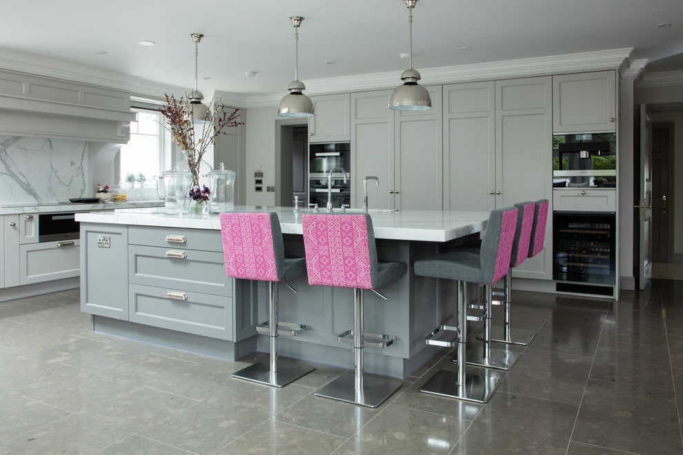 Soft chairs with pink floral print in the kitchen, decorated in gray and white