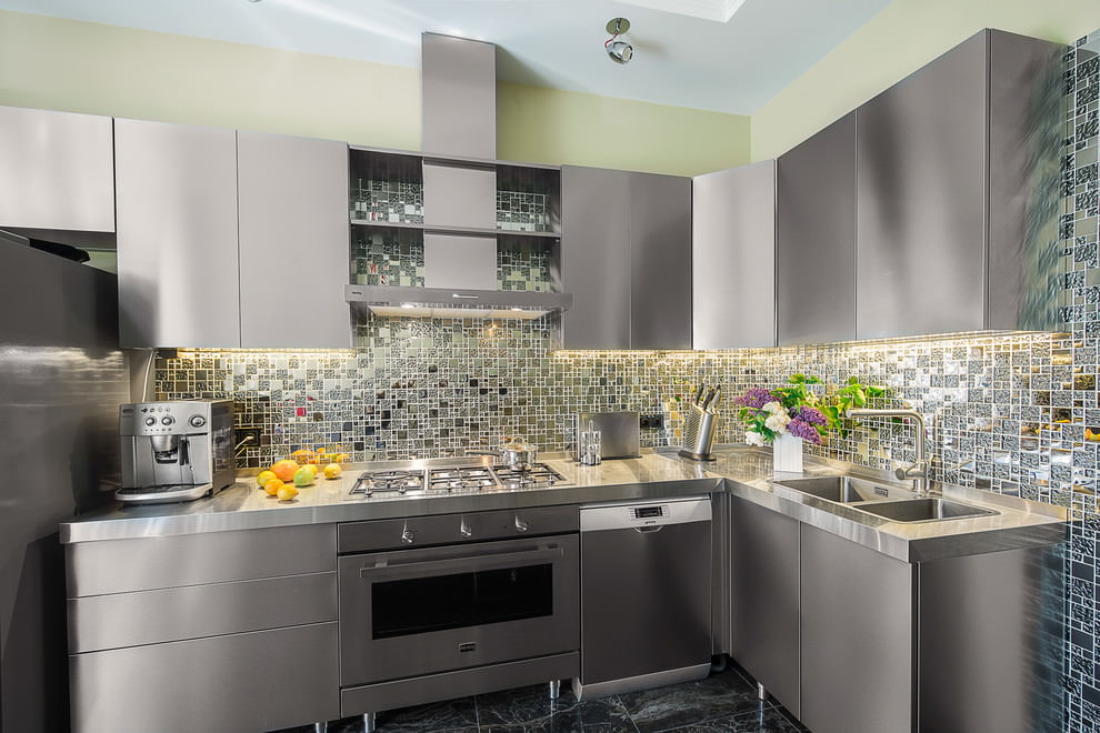 Gray tones will fit perfectly into the finish of a kitchen apron. This is very practical, because pollution on such a surface will not be evident. An unusual accent can be created by using a snow-white vertical surface. It will shade the apron and become a wonderful background for him. The working surface can be decorated in a wide variety of options: matte or glossy ceramic tiles, metallized mosaics or gray "metro" tiles.