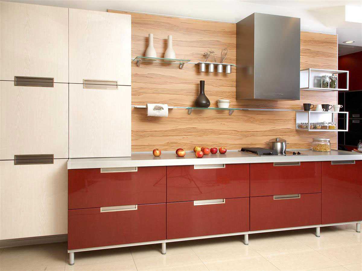 8. Traditionally, red cuisine is chosen by ardent, extravagant, passionate and loving natures. But with red it is easy to overdo it, especially when the shade is chosen incorrectly. Such a decision is well perceived in the "trio" with a white background and black contrast. The overall impression depends on the style.