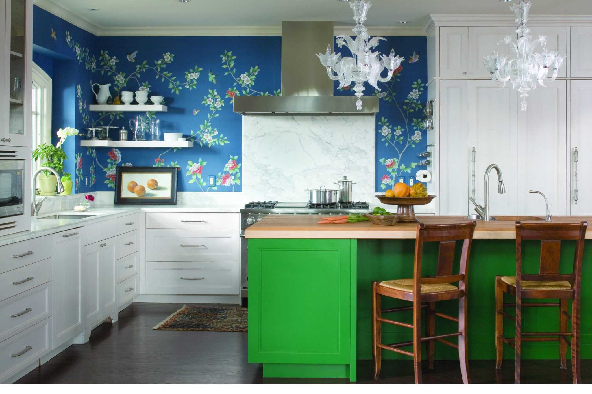 10. Although the blue design does not contribute to appetite, such a corner of cleanliness and coolness will be appreciated by residents of warm latitudes. A similar design is considered traditional for the Mediterranean, Turkish, Greek, Moroccan and marine stylistics. The combination of blue with other colors in the interior of the kitchen involves a white or blue background, blurry shades and a bit of emotional contrasts in the warm palette.