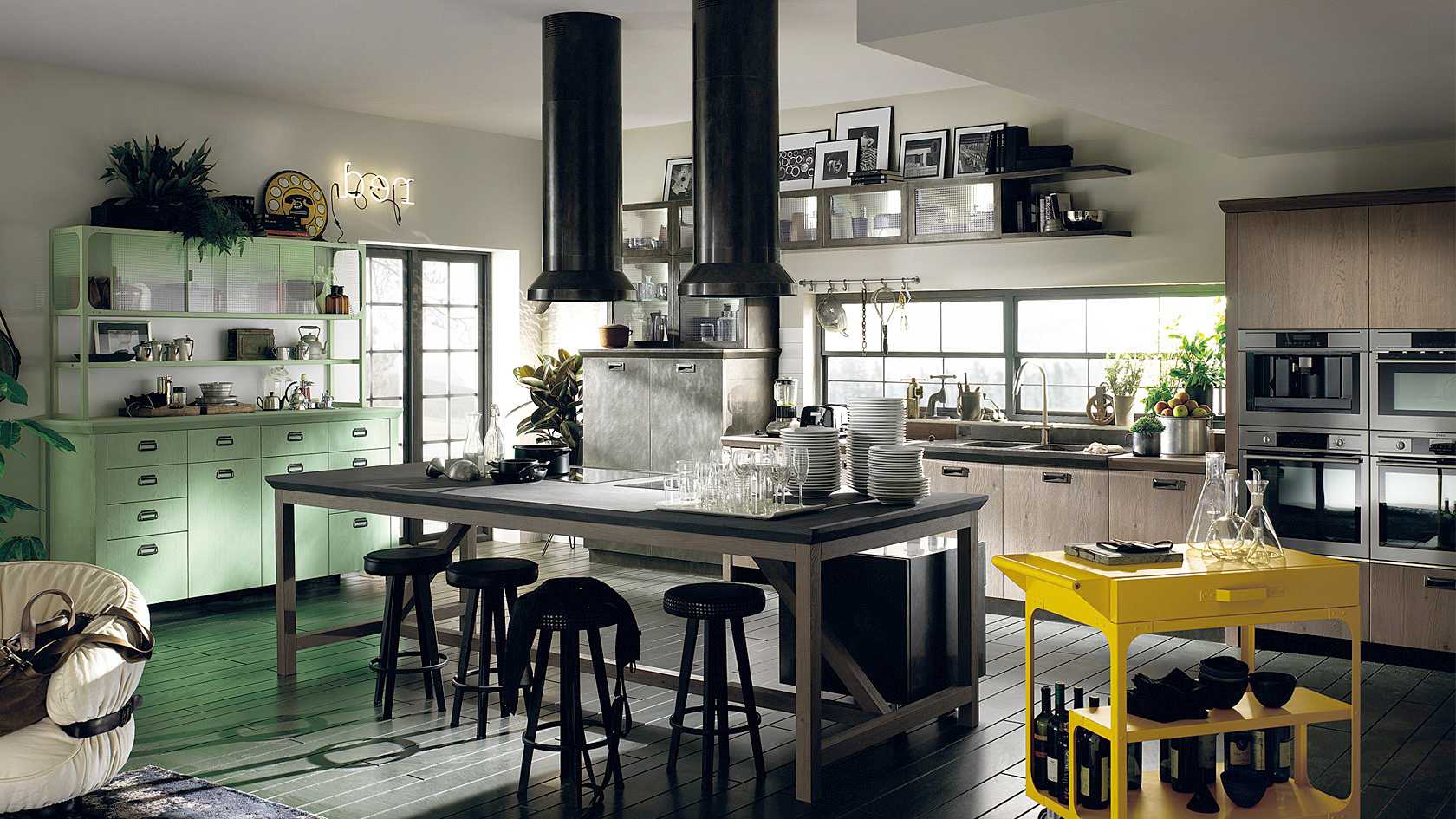 4. Today, loft, techno, high-tech, and other urban styles are in fashion. It is practical, bold and extravagant, especially in the catering department. Those who like chrome surfaces and metal in all its forms will have to work hard to create a welcoming atmosphere. Window textiles or original design curtains, elaborate lamps, furniture with beautifully defined lines and stylish household appliances will help. They will add life to a large aquarium, a pleasant velvety upholstery of the corner and dishes with painting.