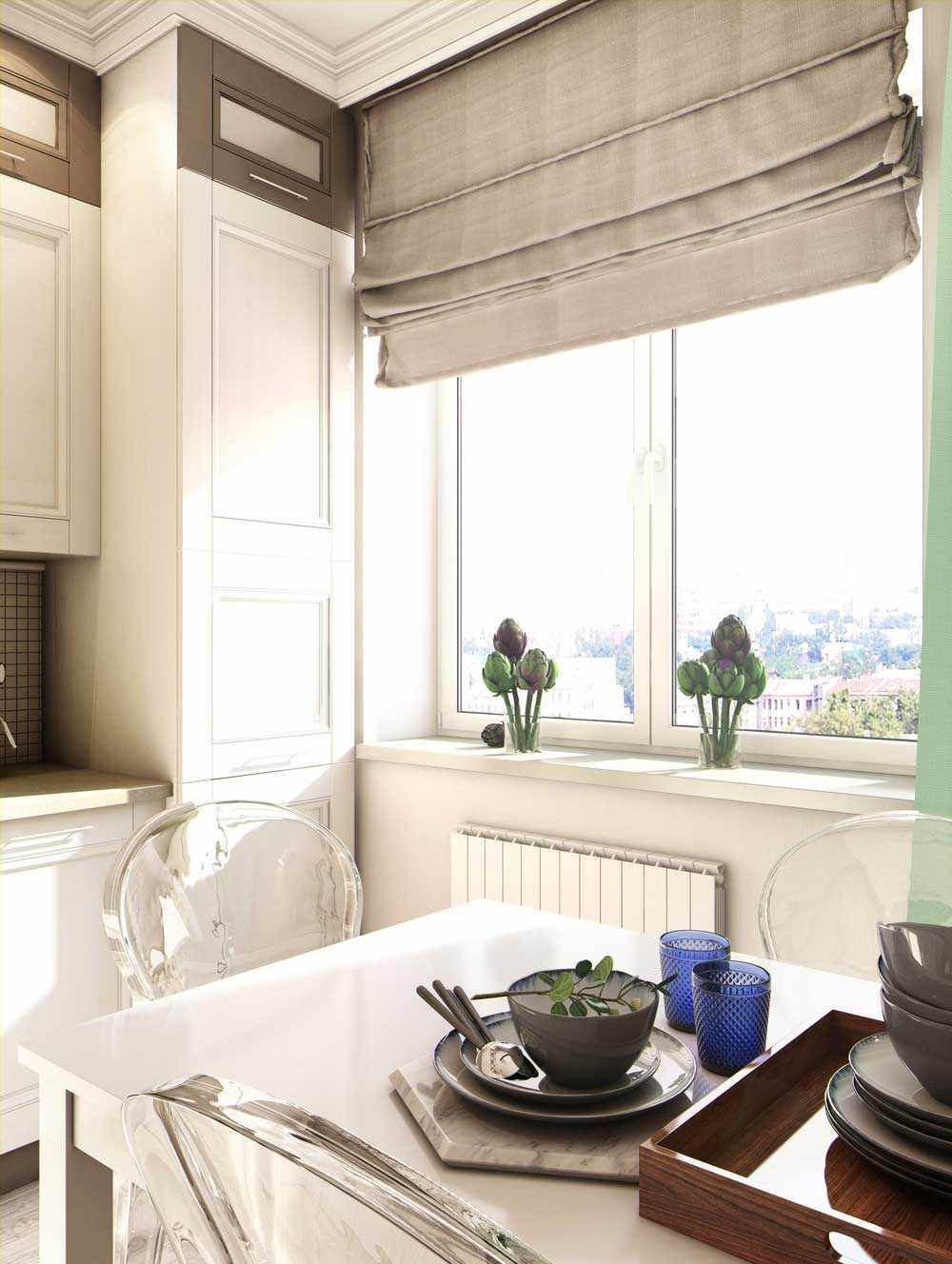 If the kitchen has access to the balcony, it is not recommended to hang ordinary curtains