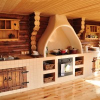 The traditional style of this country kitchen is a rustic setting, for which clay dishes and textiles are used. Artistic tone and family style will make a large Russian samovar, located on a wide dining table. It is recommended that only wooden furniture be installed here, and the decoration is best done with a material such as wood. If this kitchen is built and equipped correctly, then there you can cook dishes in the spring, and summer, and autumn, as well as in winters, if they are warm.