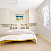 1. A small square bedroom. When all sides have the same length, then there are no special problems with the arrangement of furniture. You can set the bed in the center, the headboard to one of the walls, and set high chests of drawers or pencil cases on the sides. A sliding wardrobe can be placed against the opposite wall.