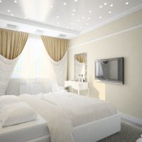 A snow-white room is always calm, relaxation and peace. There will be no sleep problems in such a room. However, so that the white bedroom does not resemble a hospital room, you should choose one contrasting color and create small accents using textiles and paintings. Also, for a special romantic or cozy atmosphere, you can use colored lighting.
