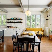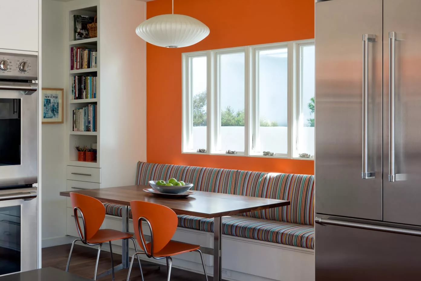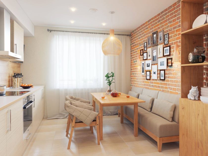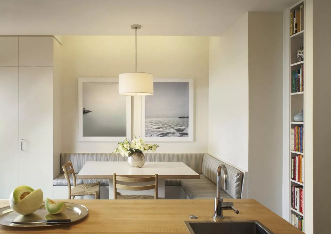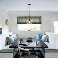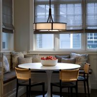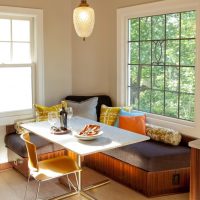 The location of the sofa depends on other furniture, the geometry of the kitchen, as well as the purpose. It is considered ideal if it will stand against the wall in the L-shaped form. In this case, you can put a table opposite. In tiny kitchens, sofas should not be placed. In some cases, it is better to choose a product without corner blocks. In a room with a large area, the sofa does not fundamentally combine with a table, since it can take a place in the recreation area.