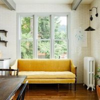 Such an interior allows a model of any design. It can be a straight shape or with bends. The material does not really matter. Practicality comes first. Designers recommend light monochromatic shades that resonate with curtains or other elements of the room.
