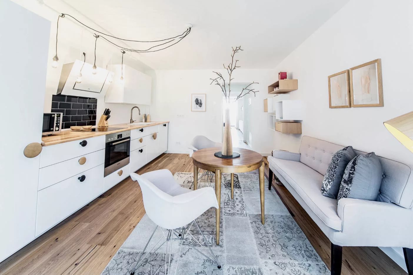 The features of the Scandinavian style include snowy colors, the presence of natural materials, minimalism and comfort. A sofa with leather upholstery and built-in drawers will look harmonious in such a kitchen. A bright accent of the interior will be a woolen plaid.