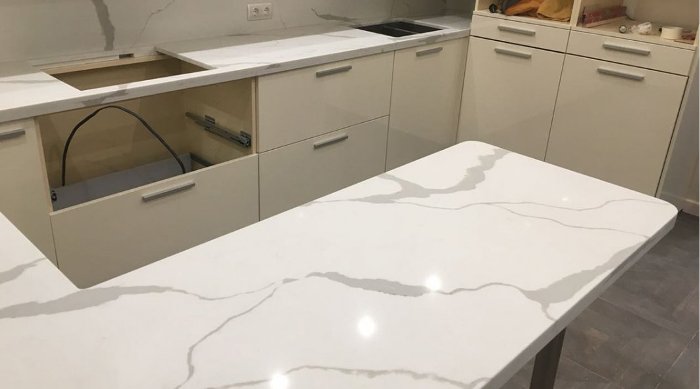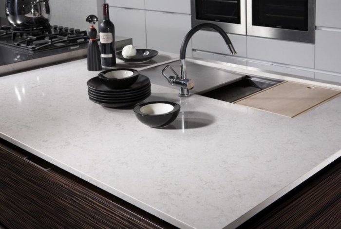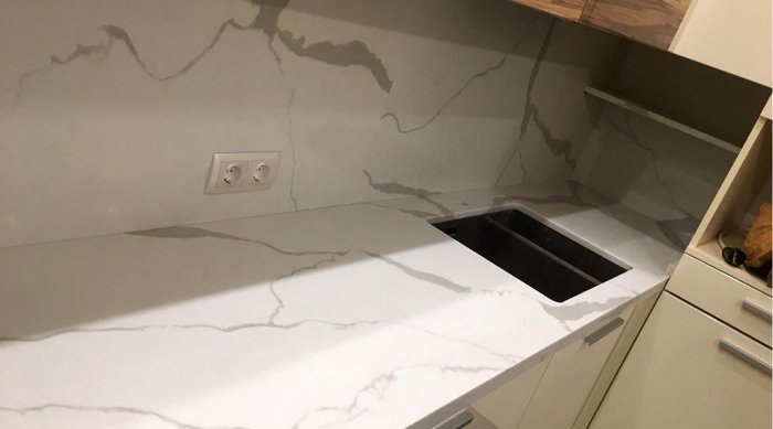 The fact is that quartz agglomerate is produced from crumbs of quartz, which really has a natural origin. This stone is considered one of the most durable.Worktops made of material are considered artificial, because the production method is used to manufacture the product. That is, quartz is crushed, binder components and pigment are added to it.