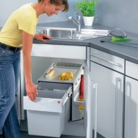 A rectangular corner kitchen cabinet under the standard sink is the most popular option. The design has an internal corner of 90 degrees, it is easy to integrate into any headset. The product is not too functional, has a small capacity, is not always suitable for "complex", intricate interiors.