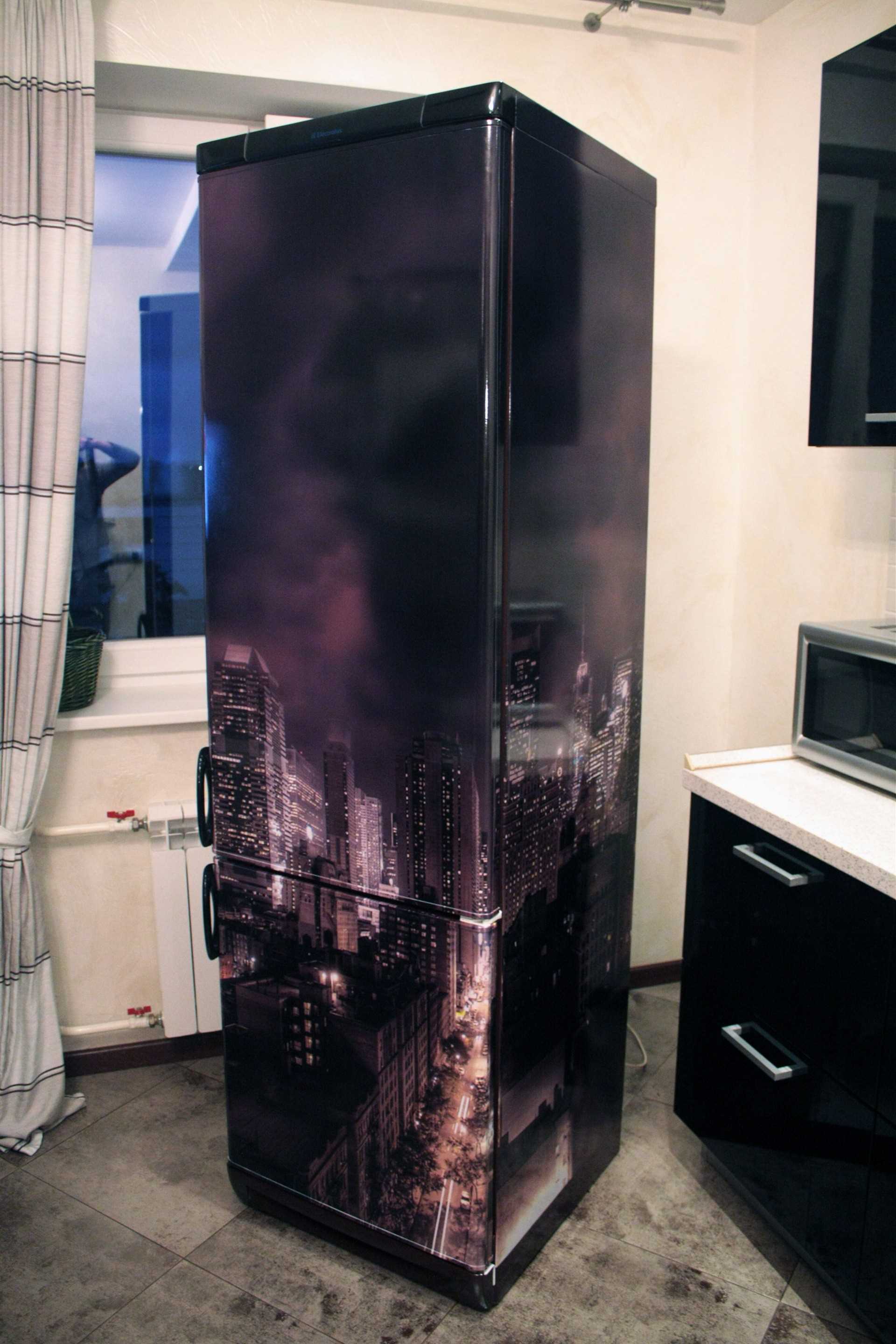 In the option to completely cover the refrigerator with a film, there is also a practical side. This coating is dense and will protect the surface from scratches. From time to time, you can change the film or completely remove it, and your refrigerator will have a new look without scratches and chips.