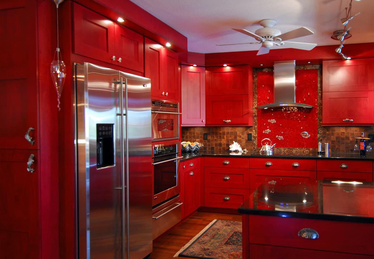 There are options for the design of the kitchen, where they successfully combine natural shades with bright background colors. It can be: yellow, red, green, blue. But, the furniture is only neutral. Surfaces can be glossy, matte.