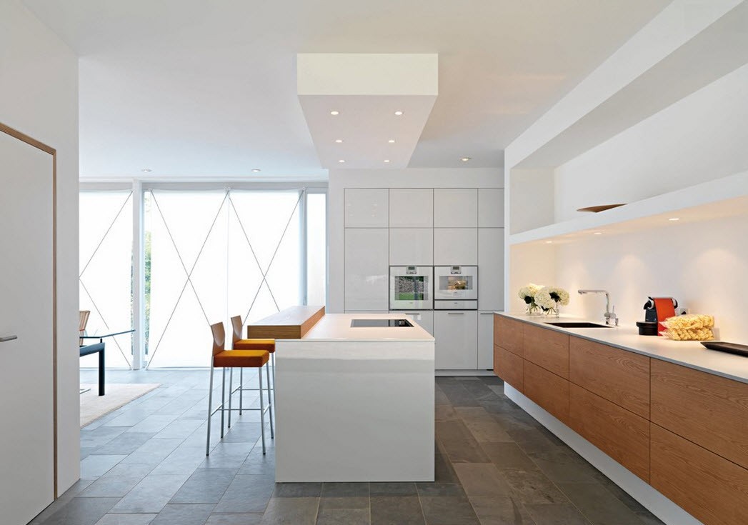 In order for the built-in kitchen to dissolve in space, it looks as modern and stylish as possible, you need to think about facades. To get the desired effect, facades should be matched in the same color scheme as the walls. Another important detail is the lack of various household utensils on the surfaces, so you need to think in advance about where pans, plates and pans will be located. An excellent option would be to use a capacious unit consisting of pencil cases with a minimum number of fittings.