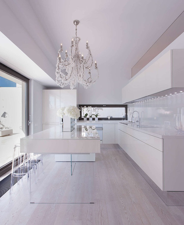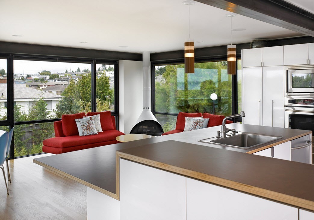 In the interior, the predominance of metal and glass is noticeable, which are complemented by plain and contrasting color schemes.