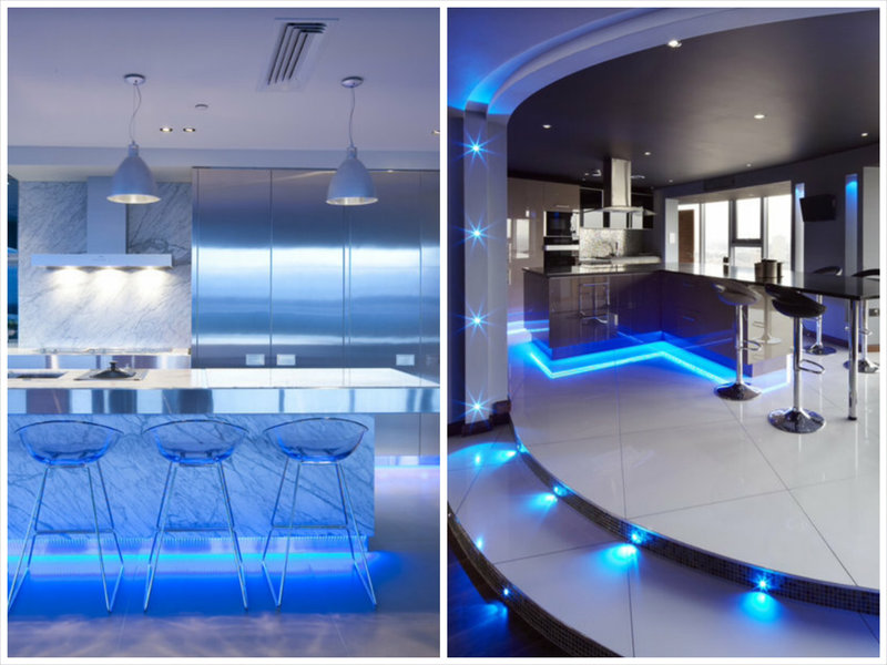 As mentioned earlier, correctly exposed light in the apartment is the key to a successful design at high tech style. Thanks to the use of neon LED-backlight, the kitchen will look as futuristic as possible. Particular attention should be paid to LED backlighting. Thanks to her, the room will look light and weightless, not overloaded with various elements.