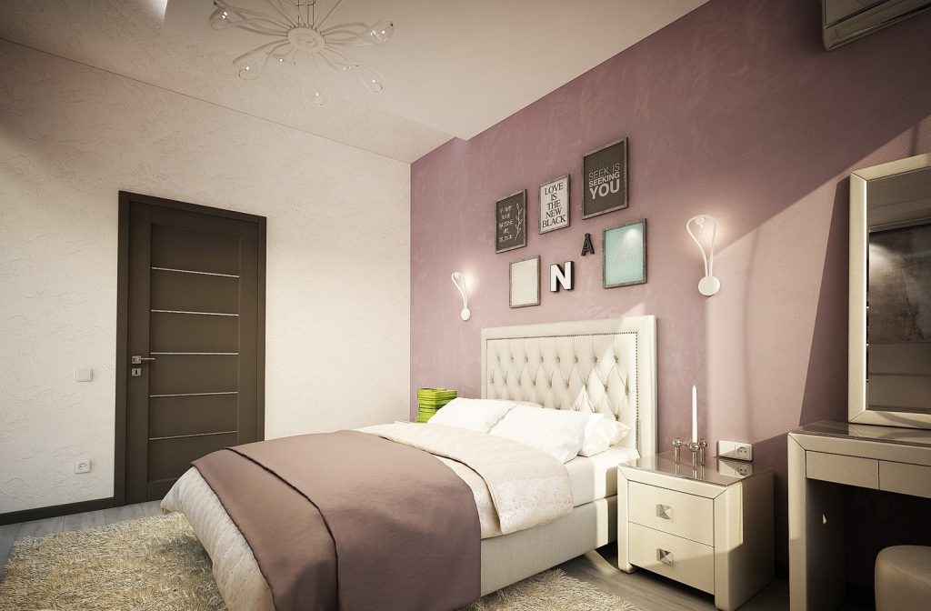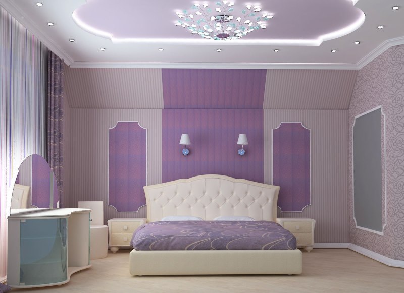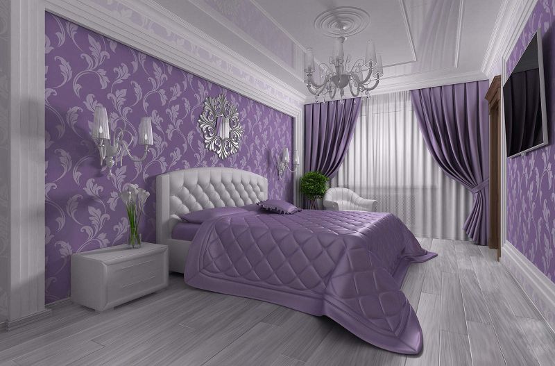 The most spectacular lavender color in the interior of the bedroom. Its different shades look unusual and give a sense of peace, which is conducive to a good night's sleep, and in the morning they tune in to positive and give a boost of vivacity.