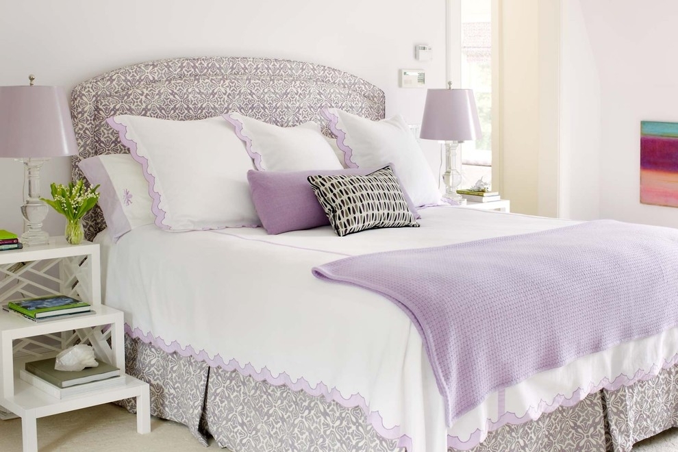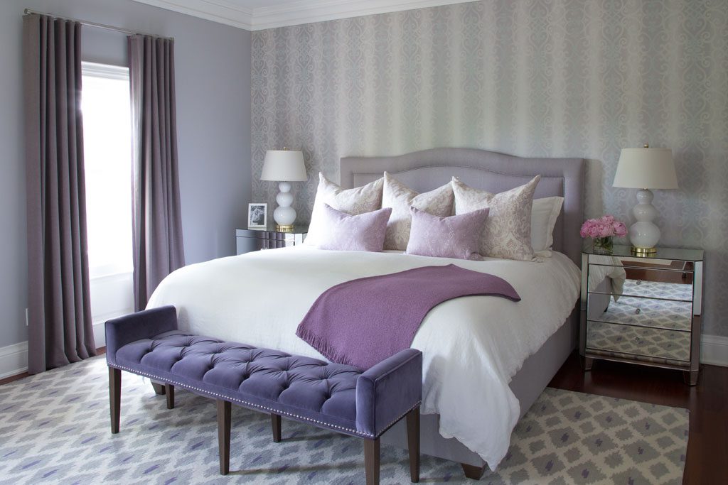 In the event that you do not dare or do not want to make lavender walls, “dress” them in light neutral tones, and add a shade of lilac or lavender to the facades and upholstery, the head of the bed, pillows, and lavender curtains.