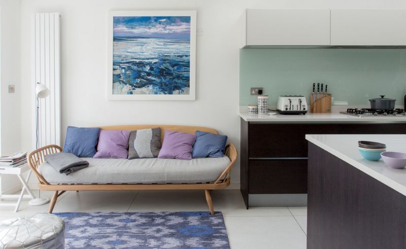 The original minimalist interior features a dark floor, lavender-colored sofas and gray walls.