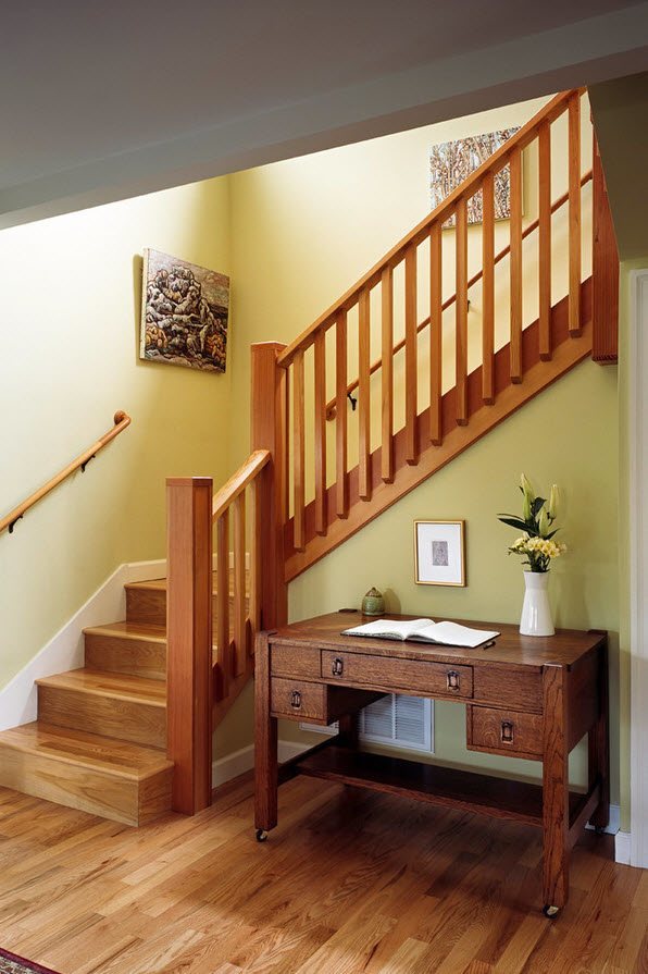 The design will become the main part or will perform secondary tasks. The front wooden staircase is becoming a key figure. Depending on its location, the space is divided into functional zones, furniture items are arranged. The stairs are complemented by decor, create a special highlight. A minor object plays a less prominent role in the interior. It is usually made of cheap materials, do not use decor, and is attached to the wall in the corridor or hall.