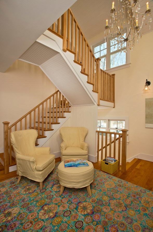 In the living room it is placed in a corner or along the wall. A staircase acts as a partition, dividing the room into sections. In the space underneath it is placed equipment, paintings, create recreation areas. Buy a finished version of wood or make an individual order. Modifications with mirror or glass inserts look interesting.