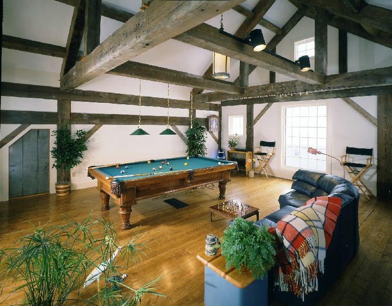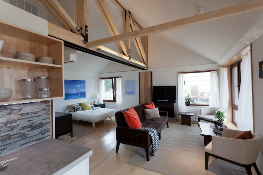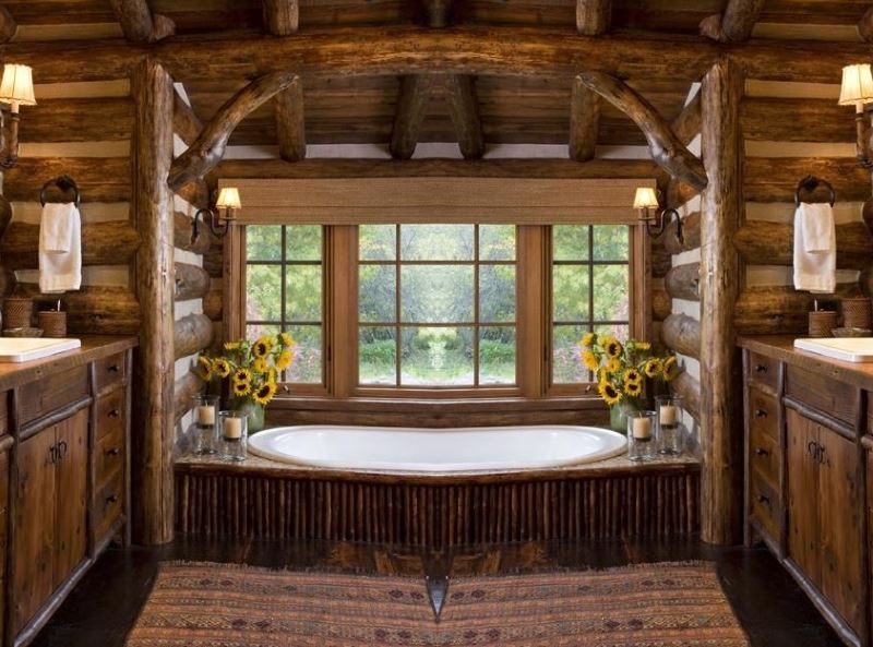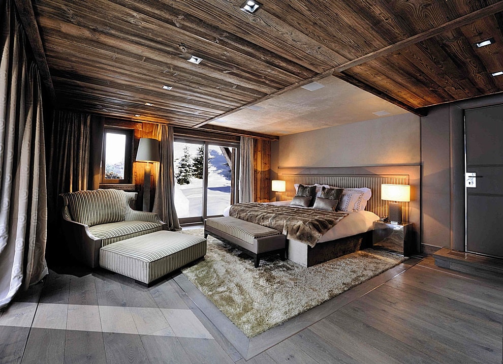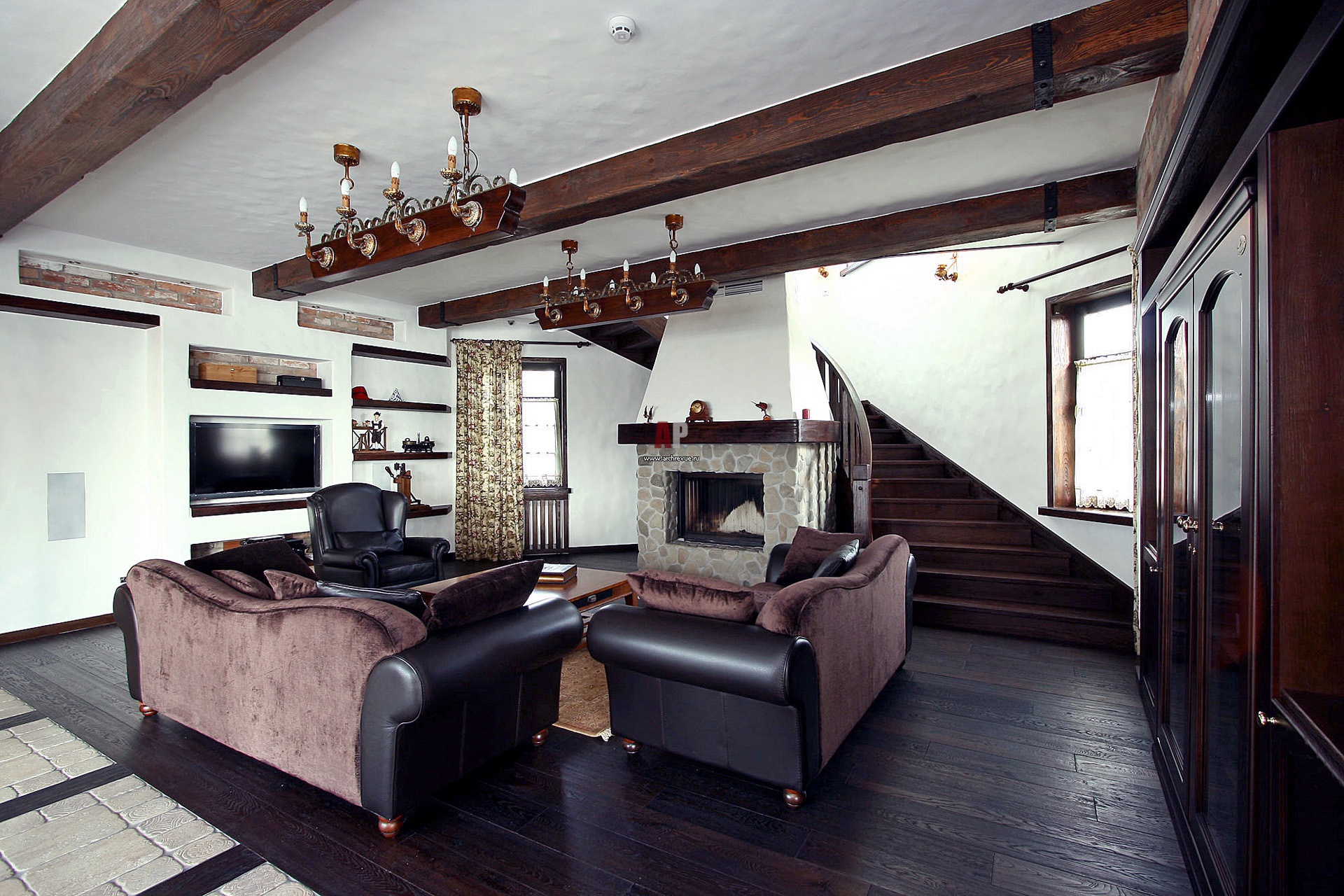 The interior decoration of the house should match the facade. Warm colors should saturate the interior of such a house. Lighting should play an important role, because the more light in our cabin, the better. Vintage dark metal chandeliers with shades or imitation of candles will wonderfully fit into the interior.