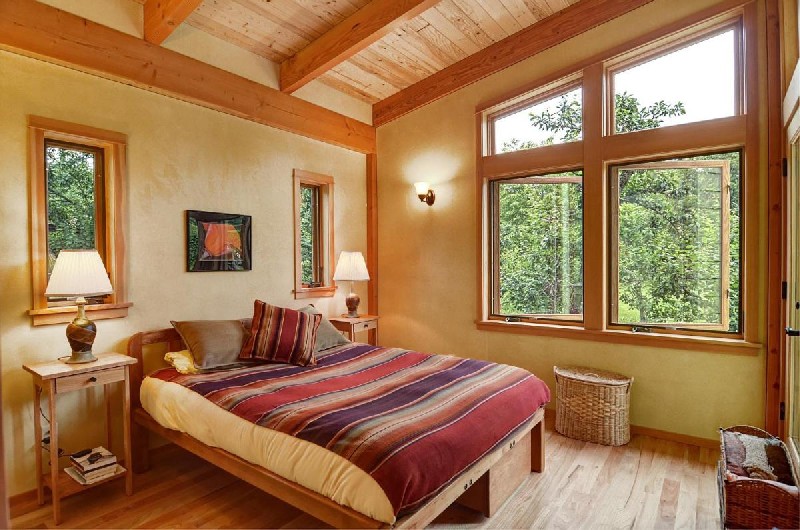 The windows in such a house are large for more natural light. Lightweight wooden window frames divided into sections, exclusively rectangular or arched, sometimes with shutters; windows should not be covered with thick curtains.