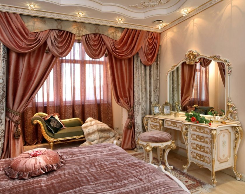 The antique style is known for its rigor and stinginess on jewelry in addition to those inscribed in the decoration of the room or in the decor of furniture. However, an exception is permissible for textiles. It is recommended to use dense plain fabrics. Straight draperies with pleats are welcome, but never lace or bows.