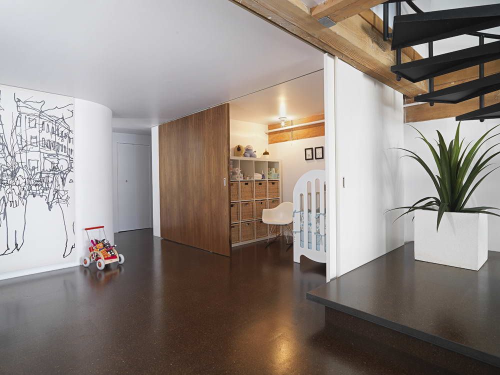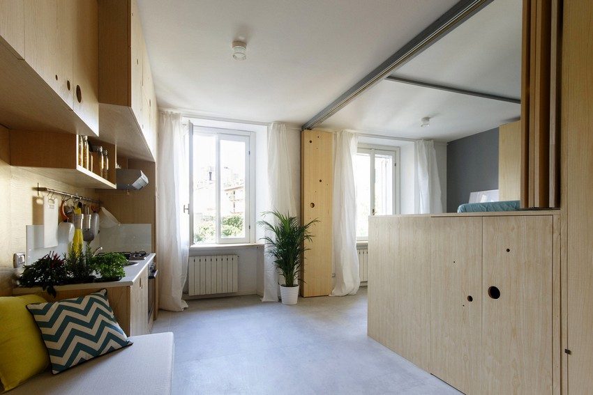 The accordion partition is easy to fold for a day, and in the evening also quickly divides the room into functional zones