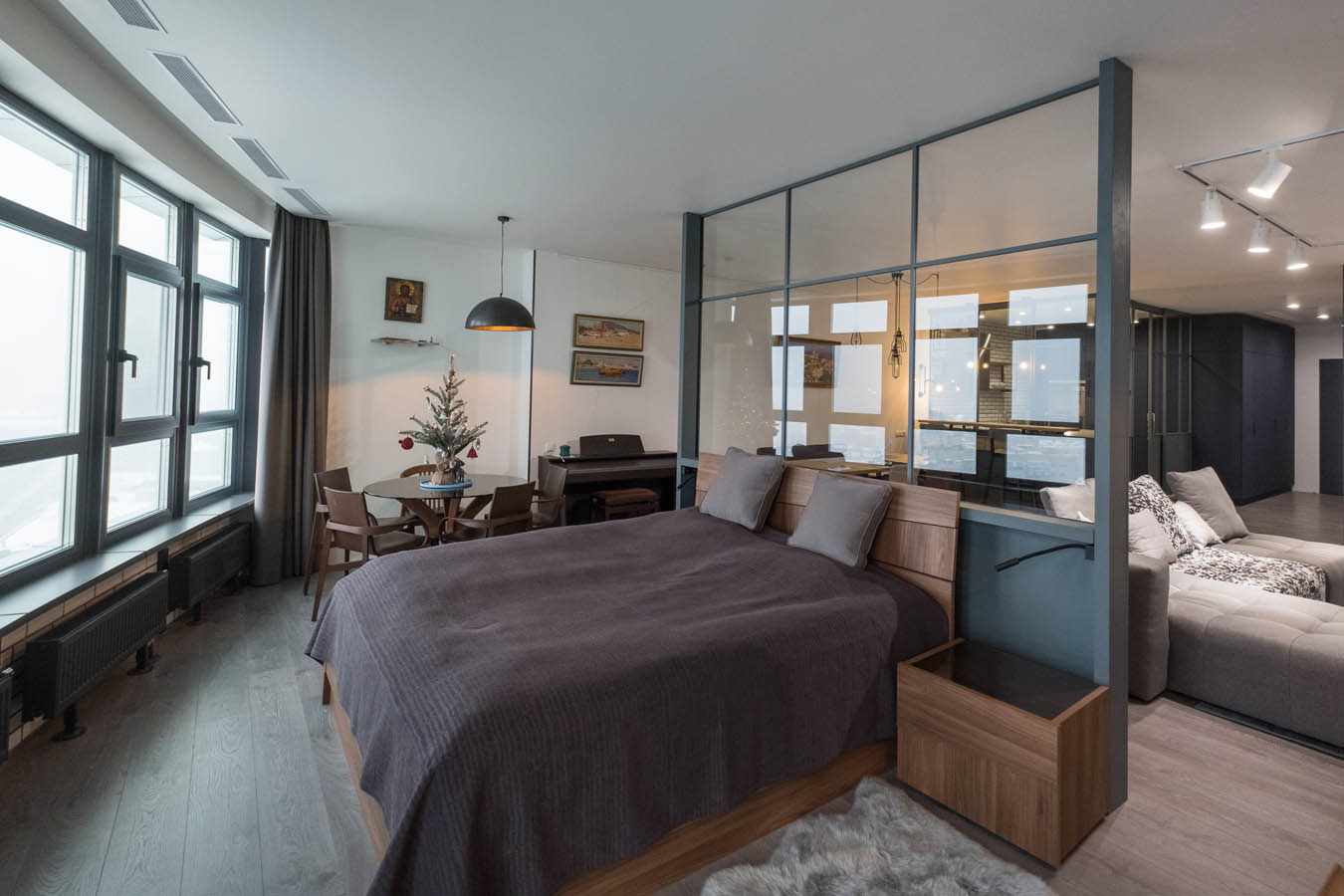 On the other hand, it all depends on the overall objectives. Transparent glass or plastic walls can limit smells and sounds in a studio apartment, but let in daylight, as in the photo.