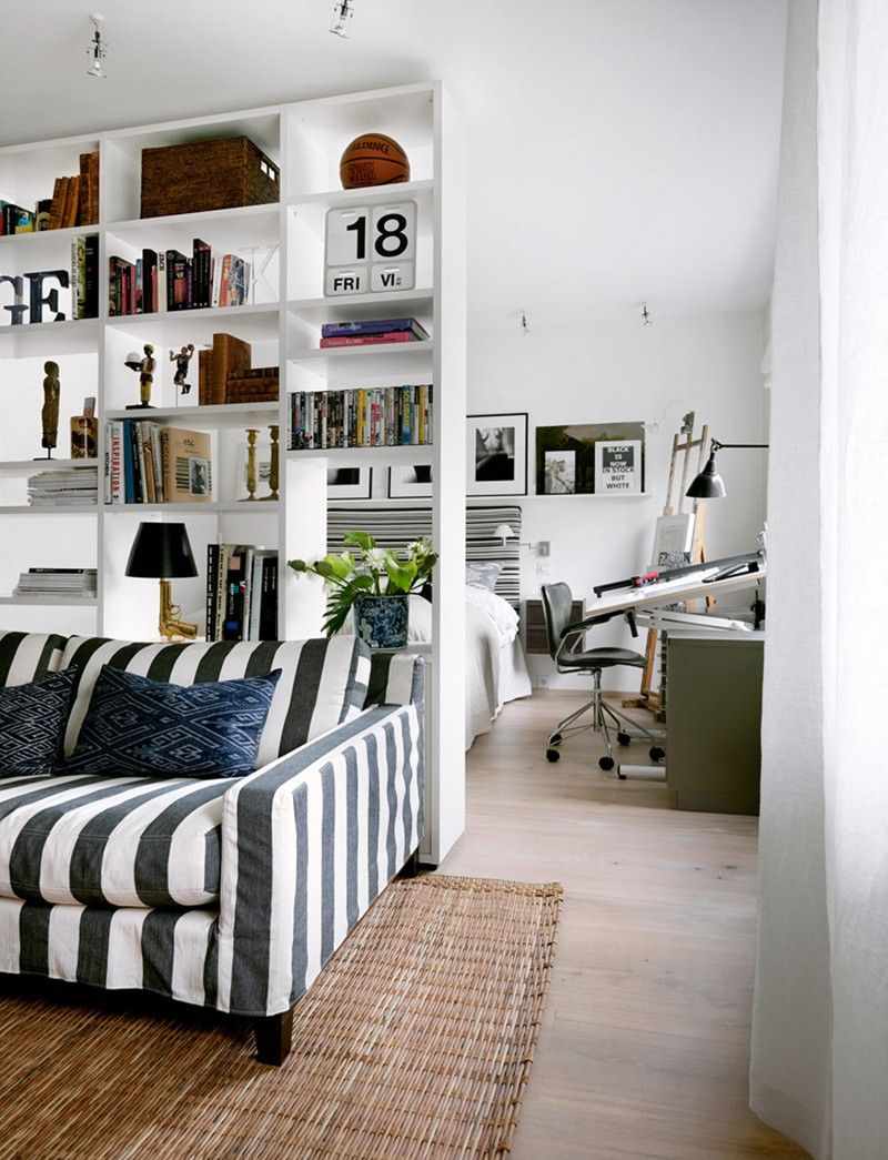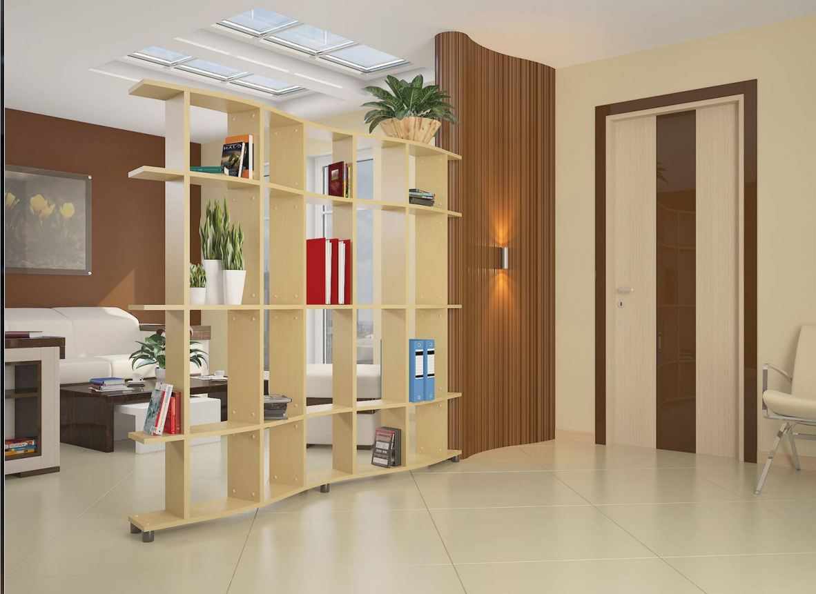 - Furniture racks are functional, invaluable when it comes to zoning.On the shelves you can place any accessories and small items, equipment and stationery. Open shelves let in enough light. They are built stationary - in the form of a low side or a full wall to the ceiling. An excellent solution for sharing an office, a nursery or a bedroom with a living room.