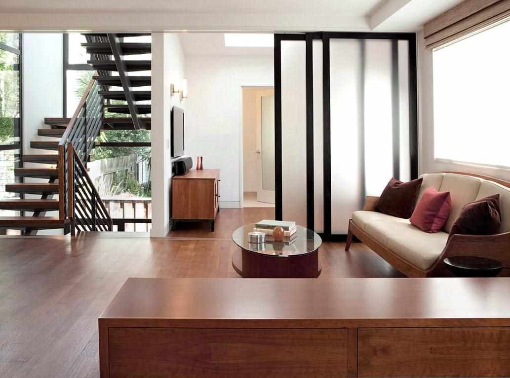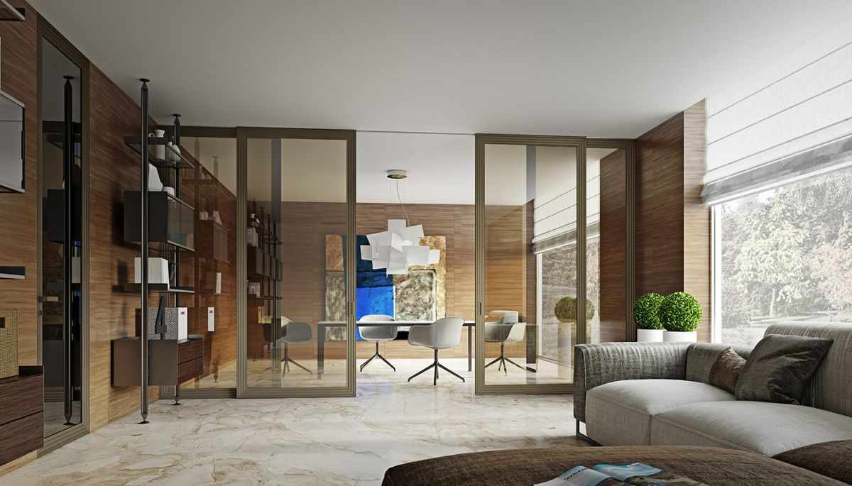 - Transparent glass is a simple eco-material, has excellent light transmission, looks fragile and weightless. The aesthetic and barrier properties of a transparent partition in the interior are undeniable. Among others, the advantage is a large selection of glass, including stained glass and sandblasting. It is indispensable for distinguishing houses without walls of large area. Among the minuses - the left "fingerprints" have to be systematically wiped. There is a difficulty with installation from floor to ceiling, it is better to entrust the profile company.