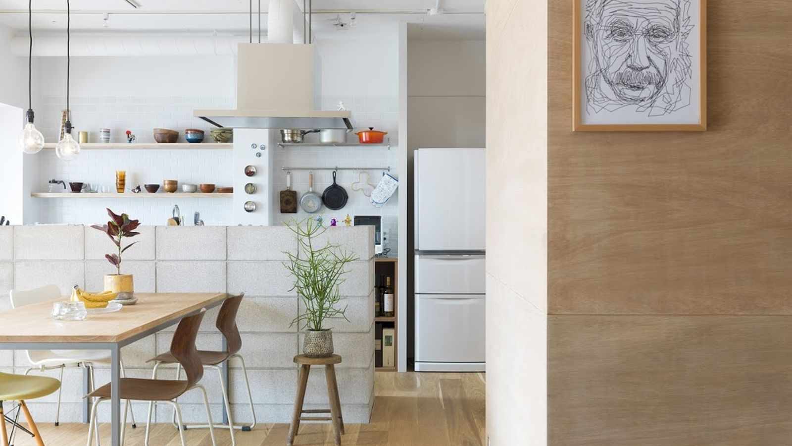 - Instead of a wall, between the kitchen and the dining room, they use a bar, a rack for dishes or a hanging plasma panel that can rotate, depending on the location of the owners.