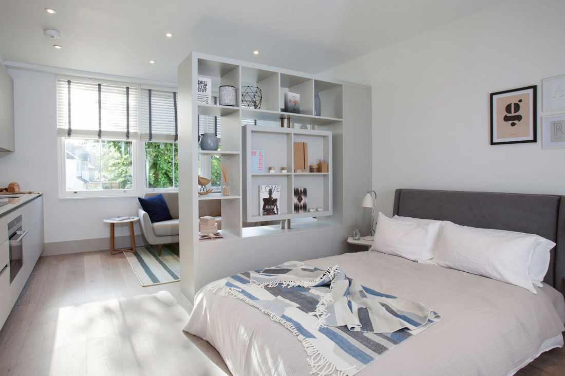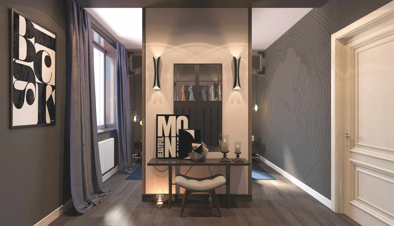 - The entrance hall of the studio apartment can be separated by a storage system and a hanger, masonry and lattice forged screen, asymmetric arch or air bubble panel.