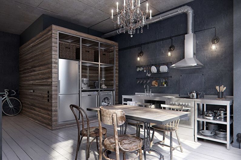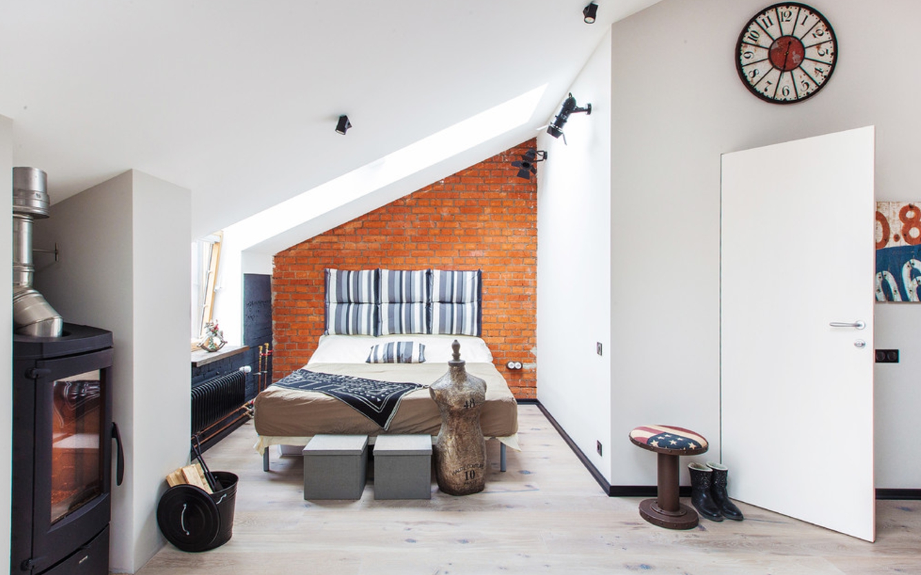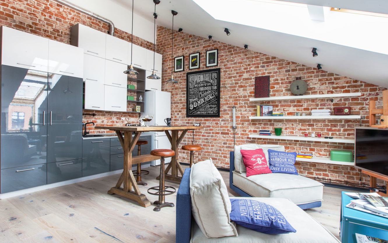 The loft style for interior decoration was chosen for a reason: it fits perfectly into the atmosphere of the attic and allows you to enter functional and practical details.
