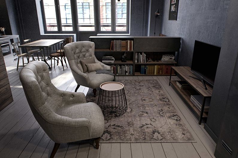 In this case, gray walls and black pieces of furniture, instead of reducing space, create a cozy atmosphere.