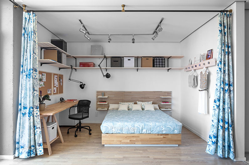 Proper zoning of the room with the help of curtains, partitions of different heights and functional furniture will help to divide the area so that there is enough space for everyone.