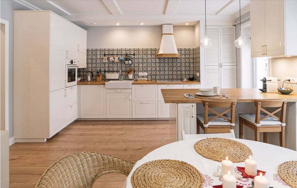 This category of styles includes Provence and country. They are distinguished by simplicity and comfort, to some extent rudeness. For provence, the best option would be a textured laminate in the color of bleached oak. But dark options also look great, especially if you add notes of antiquity to them. In country it is better to focus on naturalness, and choose dark models to match the color and texture of natural wood.