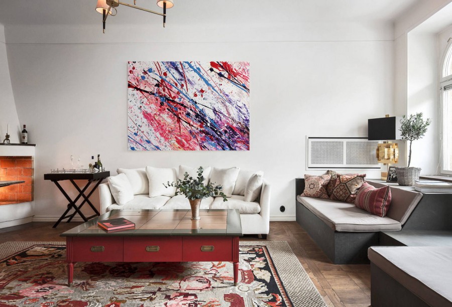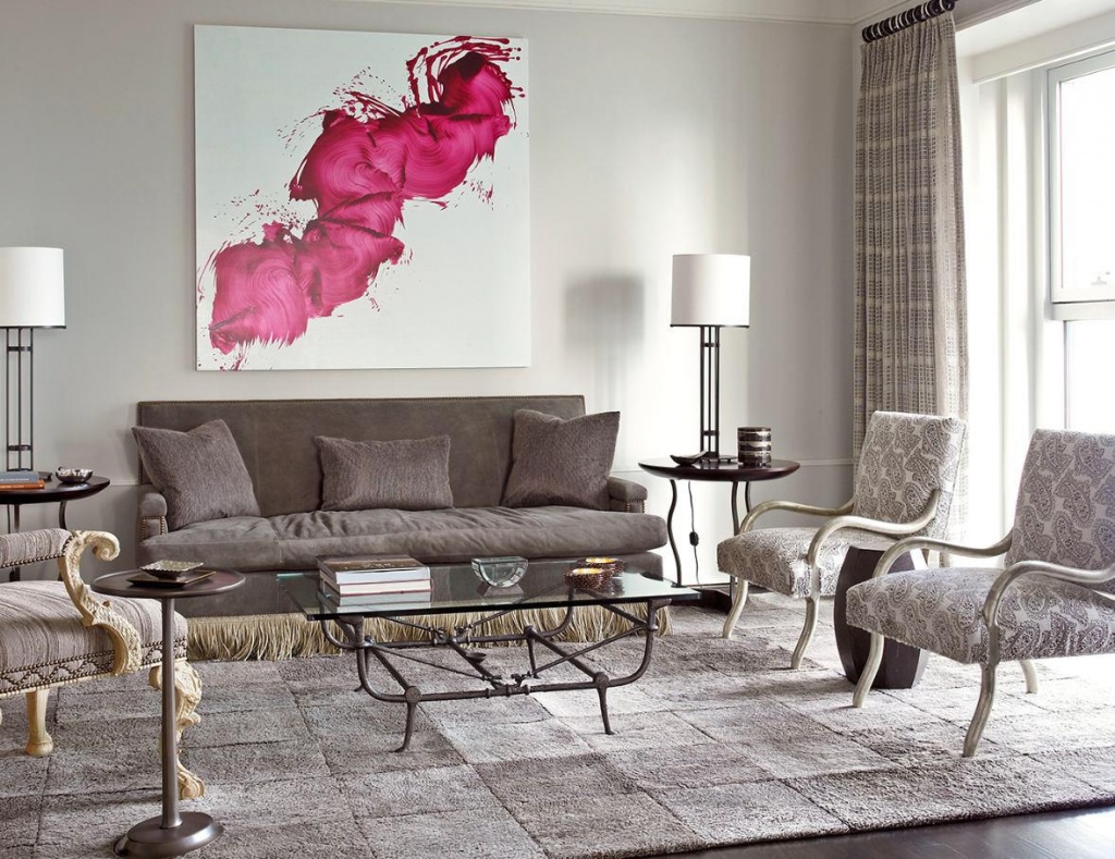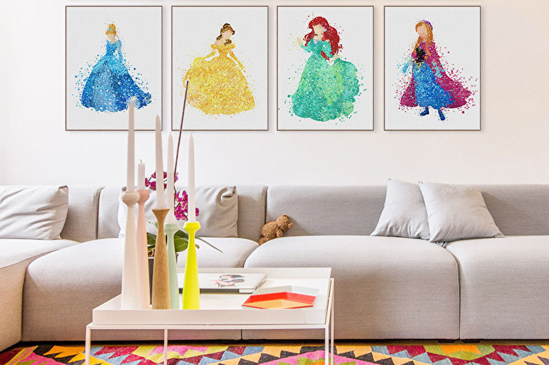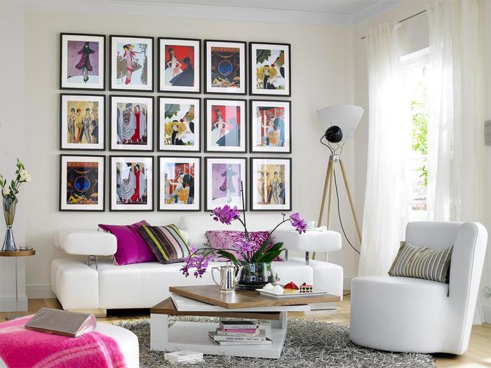 - Distribution of paintings, carpets. Of course, any style of interior will decorate the picture, the main thing is to position it correctly. Do not place it high, under the ceiling, it will be difficult to consider the composition. A large number can also adversely affect the overall appearance. Carpets and rugs are a very important component of the interior. Too bright colors visually make the room smaller, it is better to stay on muted, neutral shades. You should not use a plaid on a sofa or carefully put it on the edge, this fashion has long been outdated. It is now fashionable to place the textiles asymmetrically carelessly.