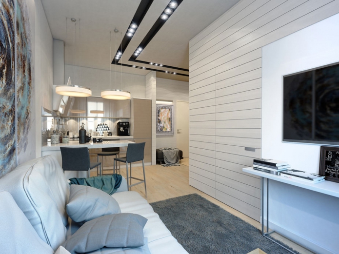 Do not underestimate the importance of lighting design. The right choice will not only save space and visually expand it, but also support the overall style of your small apartment.