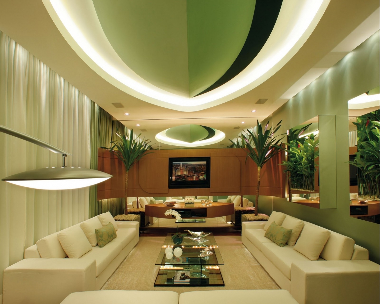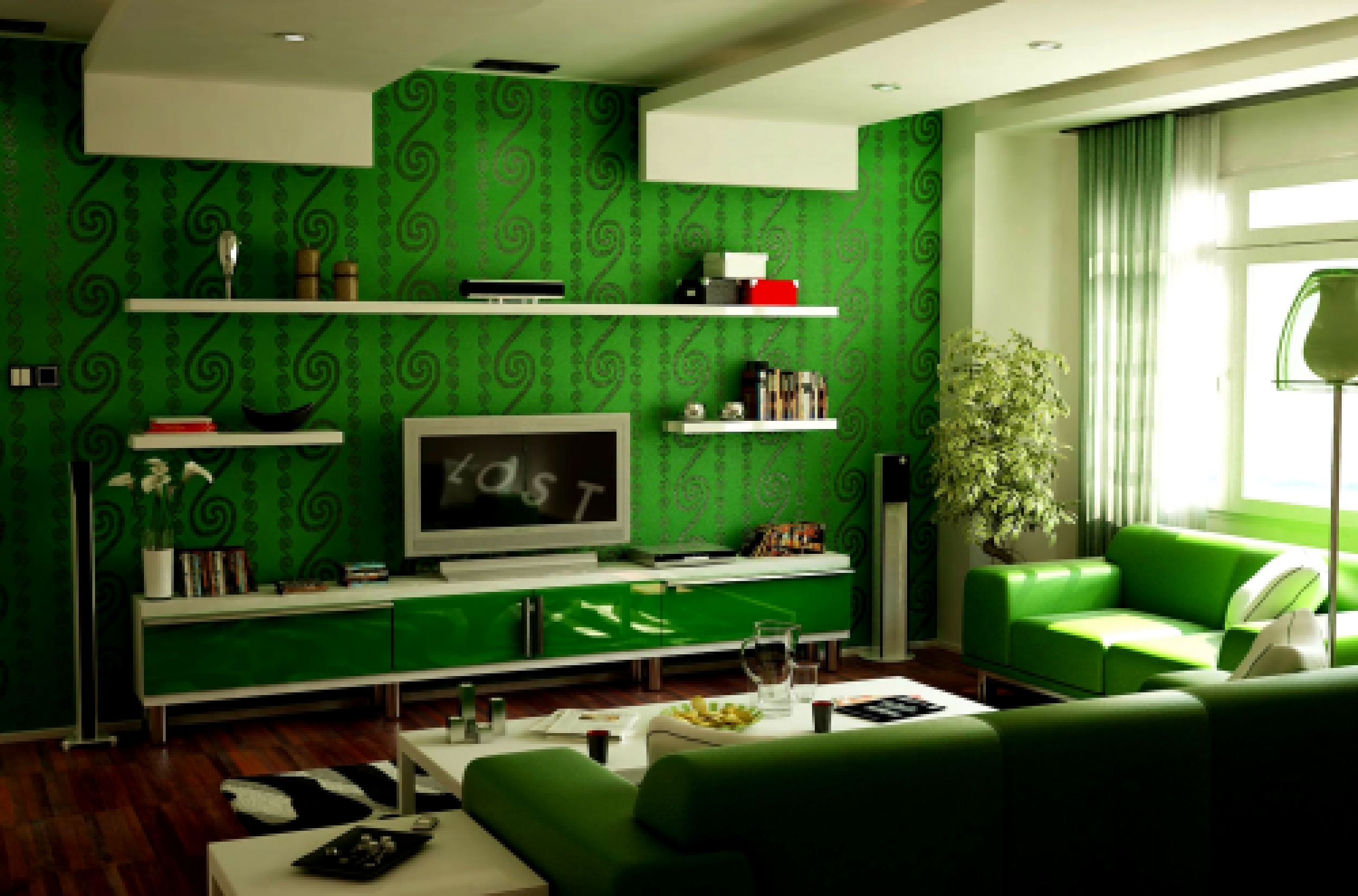 Pistachio color in the living room interior will give a feeling of freshness. Light green visually enlarges the room, so it is well suited for small halls. In the large living room it can be harmoniously supplemented with a purple accent, for example, a sofa. The white ceiling will successfully emphasize the brightness of the shades.
