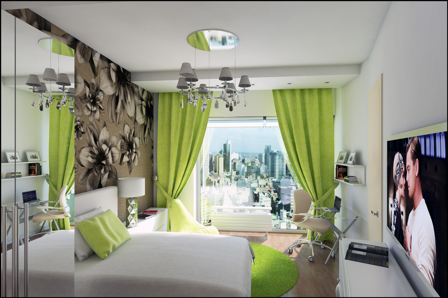 In the kid’s room, a combination with a gentle lavender will create an atmosphere of peace, and preschoolers will like a combination with juicy colors partners. The teenage room can be complemented with colorful attributes and bleached oak headsets. In the girls' room, you can add lilac, which will soften the greenish background and form an atmosphere of tenderness and comfort.
